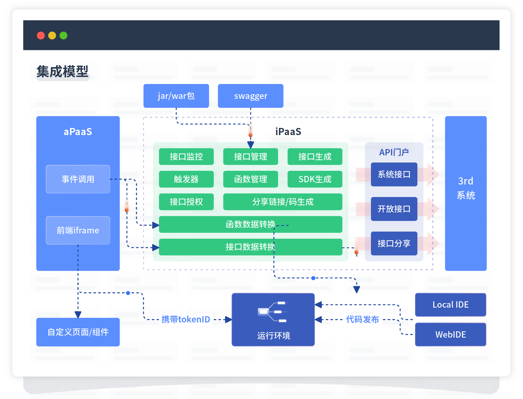 集成模型包括平台本身前、、、、、、后端能力的扩展,,,,,,,,也支持通过API门户和第三方系统进行交互。。。。。。