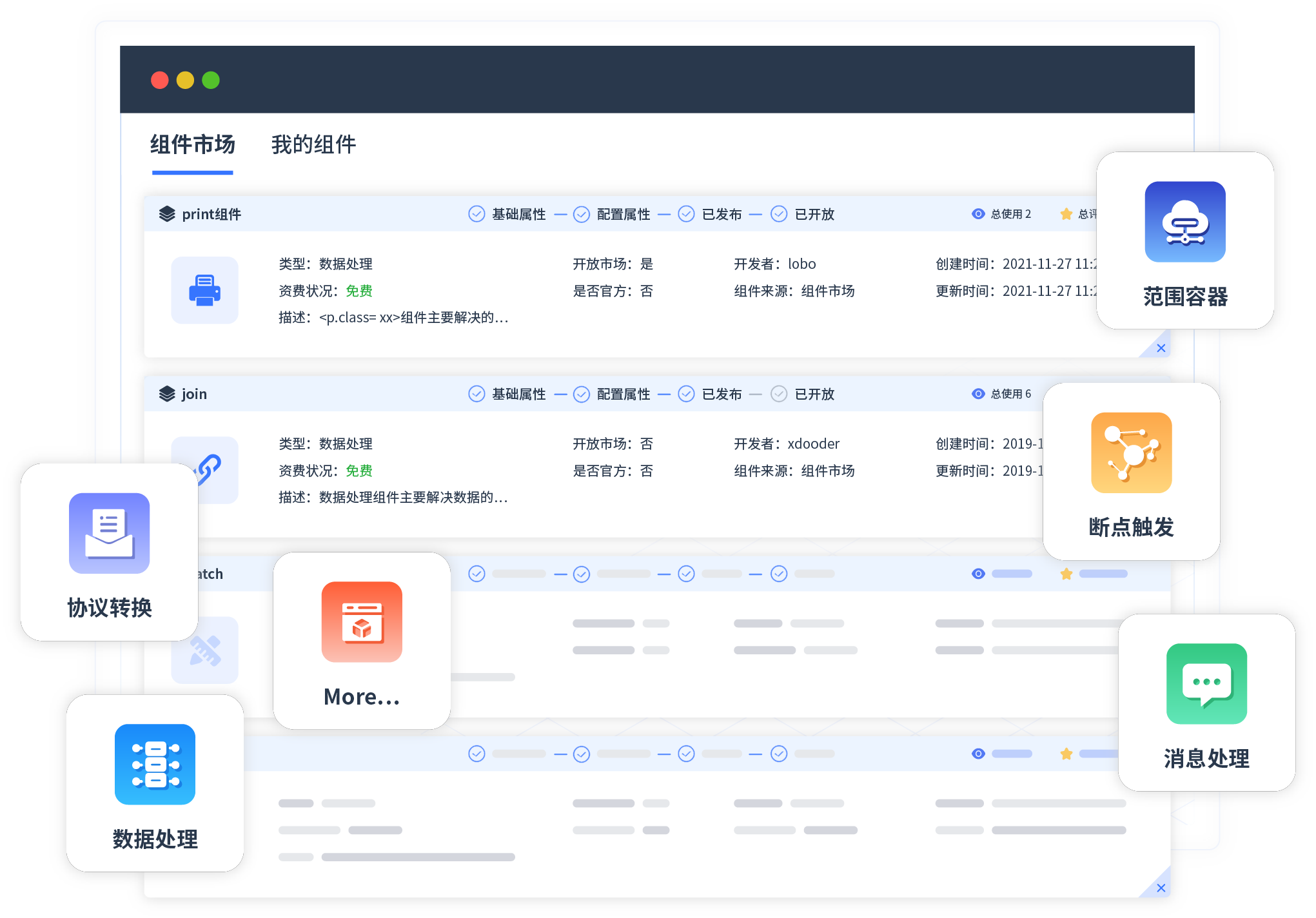 针对集成场景,,,,,,EBPAY提供组件市场,,,,,,,例如协议转换、、、、、、、、、、、消息处理、、、、、、、、、、、文件操作等。。。。。。。。。。除平台提供的组件外,,,,,,,客户可以自定义所需组件。。。。。。。。。。。。