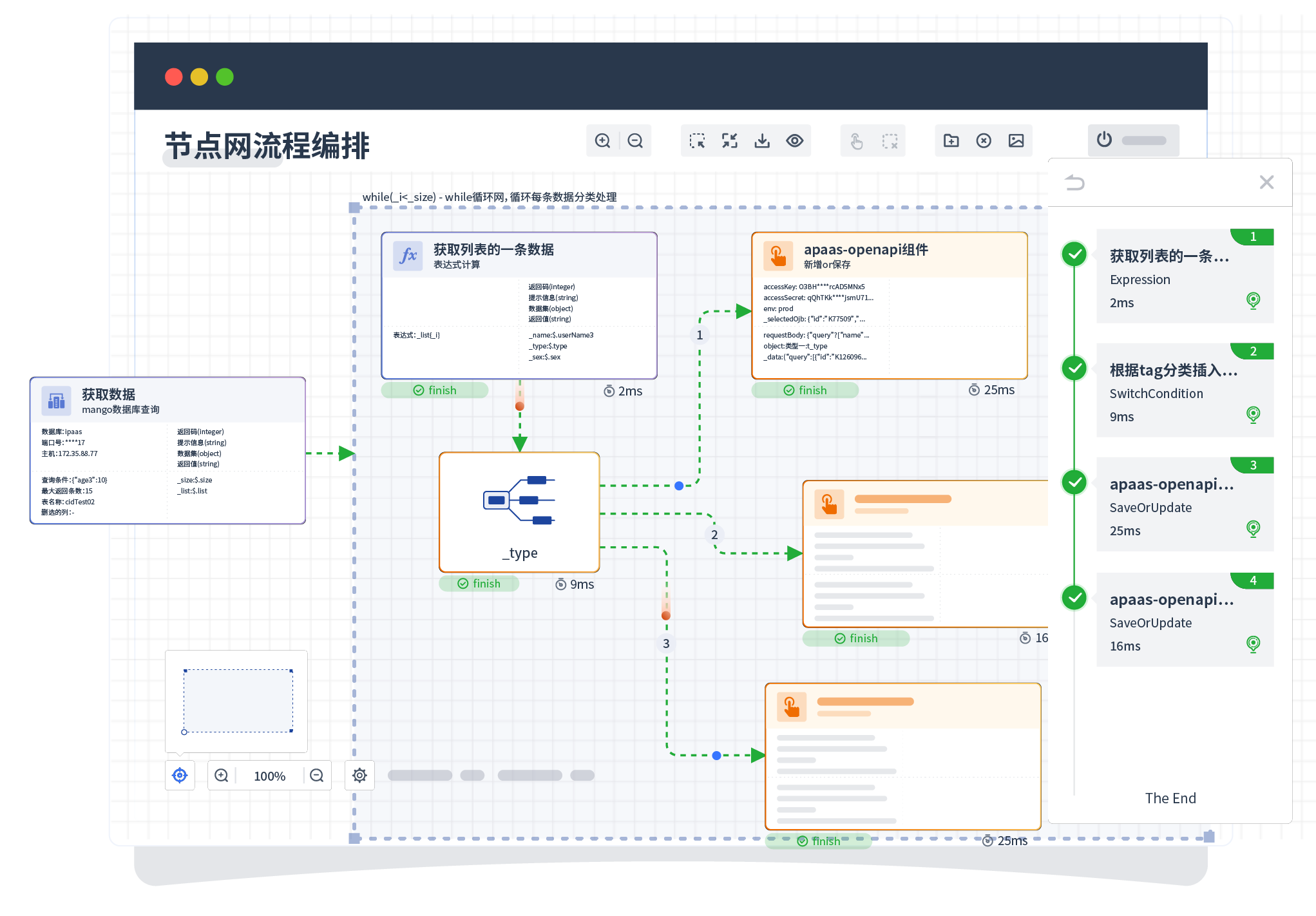 针对集成场景,,,,,,,组件定义后支持进行流程编制,,,,,,,,,,不同于传统代码方式,,,,,,通过图形化展示,,,,,,支持在线调试、、、、、、、、、、、、、日志查看和运行回放。。。。。